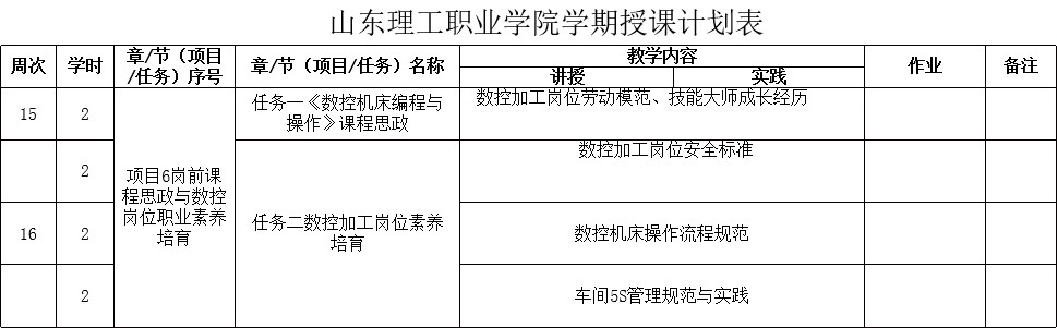 授课计划表项目6岗前课程思政与数控岗位职业素养培育