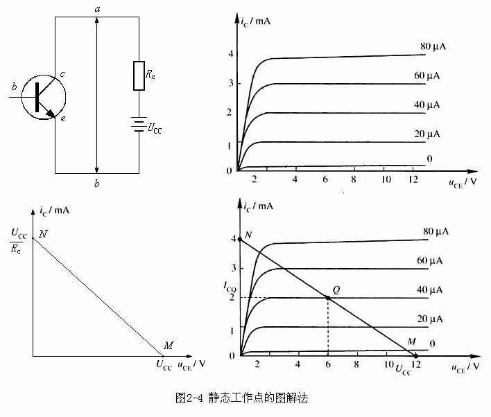 3. 找出这一条输出特性曲线与直流负载线的交点即为Q点。读出Q点的电流、电压即为所求。