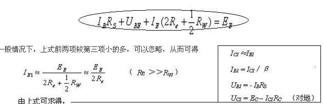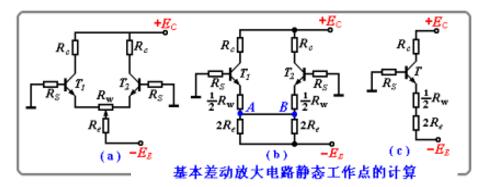 Ui = 0时,图Z0502电路的等效直流通路如图Z0503(a)所示。由于电路结构对称,计算静态工作点时,可从半边等效电路着手,图Z0503(a)的半边电路等效过程如图Z0503(b)。这里画等效电路的关键是对Re 的处理。因为Re 可等效为两个阻值为2Re 的电阻的并联,以及等电位点(A、B)之间无电流,从而又可将并联的2Re 分开,这样便将电路分成了两半,如图Z0503(c)所示。这里假定了Rw滑动头处于中间位置。 计算静态工作点可从基极回路开始,由图Z0503(c)可得: