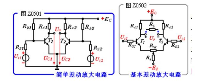 基本差动放大电路如图Z0502所示。它是在图Z0501电路的基础之上增加了一个公共的发射极电阻Re。图中Rw为调零电位器,调整它可以使IC1 = IC2 。辅助电源 - Ec 的作用是补偿Re上的直流压降,以保证管子有合适的静态工作点。此外,采用双电源供电,可以使UB1=UB2≈0,从而使电路既能适应正极性输入信号,也能适应负极性输入信号,扩大了范围。