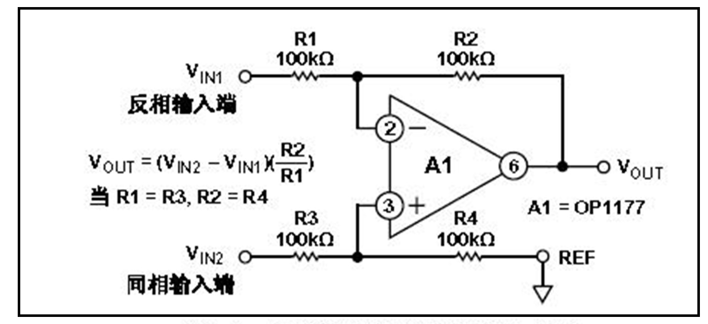 如果R1 = R3,R2 = R4,则VOUT = (VIN2—VIN1)(R2/R1),这一电路提供了仪表放大器功能,即放大差分信号的同时抑制共模信号,但它也有些缺陷。首先,同相输入端和反相输入端阻抗相当低而且不相等。在这一例子中VIN1反相输入阻抗等于 100 kΩ,而VIN2同相输入阻抗等于反相输入阻抗的两倍,即200 kΩ。因此,当电压施加到一个输入端而另一端接地时,差分电流将会根据输入端接收的施加电压而流入。(这种源阻抗的不平衡会降低电路的CMRR。另外,这一电路要求电阻对R1 /R2和R3 /R4的比值匹配得非常精密,否则,每个输入端的增益会有差异,直接影响共模抑制。例如,当增益等于 1 时,所有电阻值必须相等,在这些电阻器中只要有一只电阻值有 0.1% 失配,其CMR便下降到 66 dB(2000:1)。同样,如果源阻抗有 100 Ω的不平衡将使CMR下降 6 dB。 为解决上述问题,我们在运放的正负输入端都加上电压跟随器以提高输入阻抗。如下图所示: