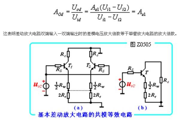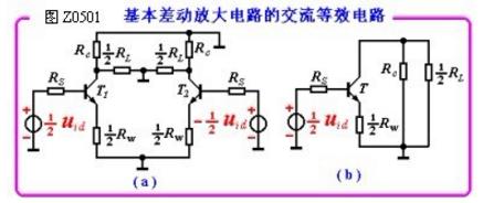 计算差模放大倍数,可采用第二单元中介绍的微变等效电路分析法。先画出图Z0502电路的交流等效电路,如图Z0504所示。这里要注意两点,一是由于Ui1 = - Ui2 = Uid /2,则 Ie1 = Ie2,流过Re的差模信号电流为零,因此,Re对差模信号相当于短路,这与单管放大电路中的Re不同;二是由于Ui1 = - Ui2 ,且电路对称,UC1升高多少,UC2就下降多少,RL的中点电位保持不变,对应于交流地电位为零。因此,半边交流等效电路如图Z0504(b)所示。将图中三极管用简化h参数等效电路代替,便可求得单管放大电路的放大倍数,即: