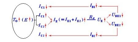 由于电路对称,所以,IC1 = IC2,IE1 = IE2,流过Re 的电流为IE=2 IE1 。当电源电压波动或环境温度发生变化时,管子的电流也随之变化,产生温度漂移,此时将发生如下过程: