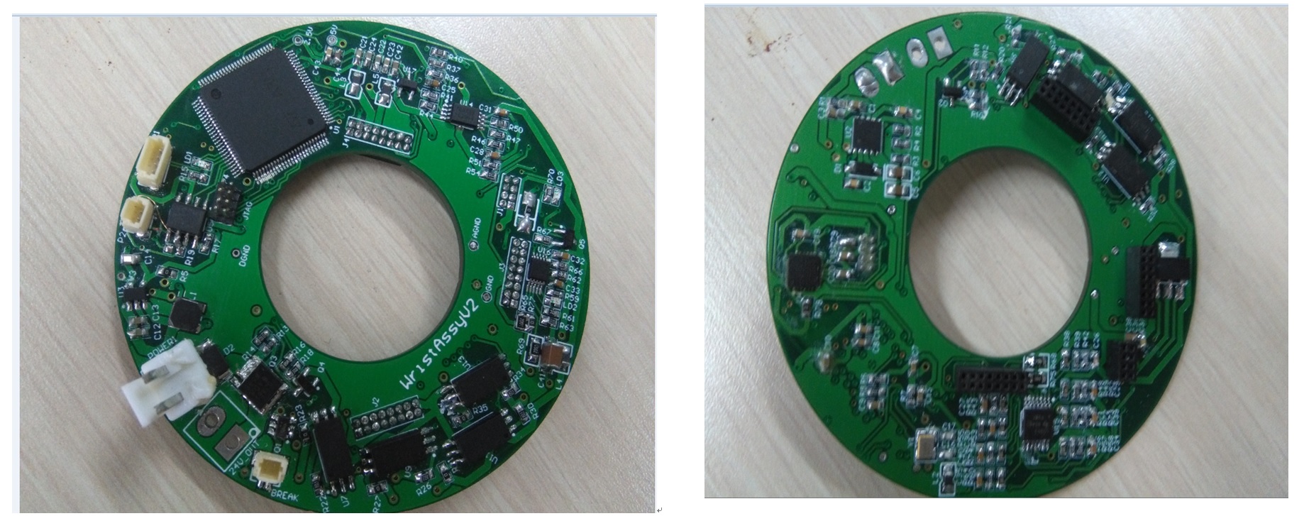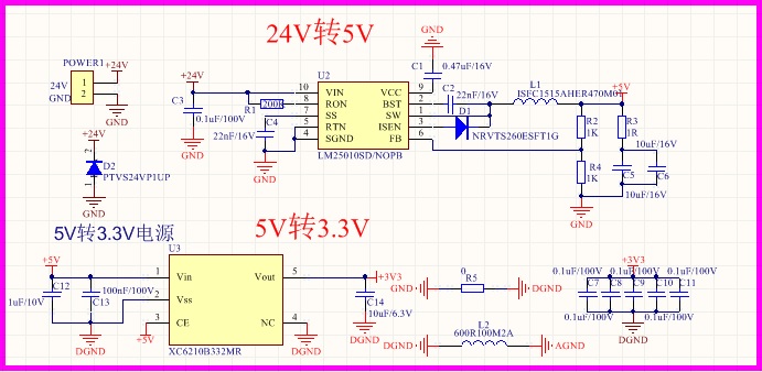 末端快接板采用24V电源输入,由LM25010开关电源芯片转换为5V输出,STM32F103处理器所需要的+3.3v电源由XC6210B332MR芯片产生。开关电源芯片LM25010输入电压24V,+5V输出电压。R2、R4电阻直接调节输出电压。电感选择ISFC1515A、二极管选择B240A。LM25010可以输出1A电流负载。
