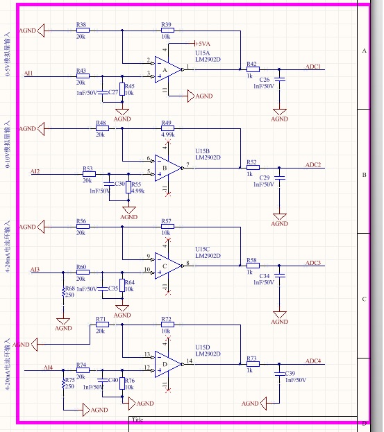 同模拟量输出类似,STM32F103提供了至少16路片内12位ADC采样通道。片内默认参考电压3V。本项目采用2.5V参考电源与DAC共用。芯片管脚电压输入范围0-2.5V,需要调理电路对0-10V /0-5V输入电压、4-20mA输入电流处理。这里选择了LM2902工业级四运放,工作温度-40-125度。
