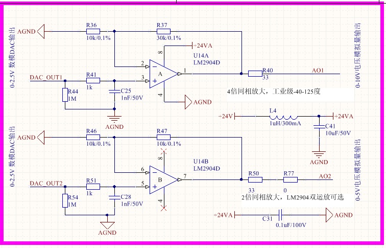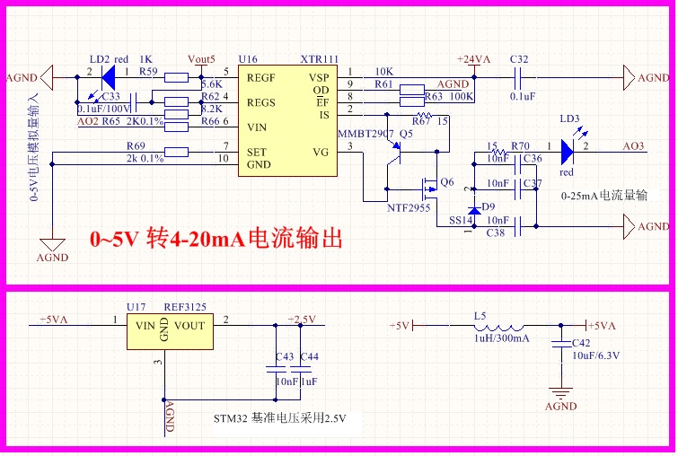 是一款电压/电流转换芯片。AO2是0-5V电压模拟量输入,电流输出范围可以通过R60电阻调节。这里选择2k,根据手册输出的电流范围则是0-25mA(5/2000)。可以数字量控制一路DAC输出将输出电流调整到4-20mA范围。MMBT2907、NTF2905是对XTR111参考电路分析后依据参数替换并采购。
