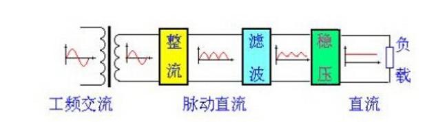 一般直流电源由如下部分组成:整流电路是将工频交流电转换为脉动直流电。滤波电路将脉动直流中的交流成分滤除,减少交流成分,增加直流成分。稳压电路采用负反馈技术,对整流后的直流电压进一步进行稳定。