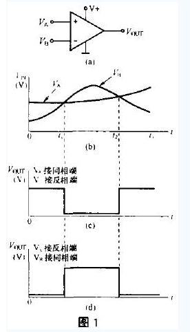 如果把VA输入到反相端,VB输入到同相端,VA及VB的电压变化仍然如图1(b)所示,则Vout输出如图1(d)所示。与图1(c)比较,其输出电平倒了一下。输出电平变化与VA、VB的输入端有关。