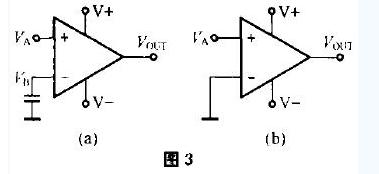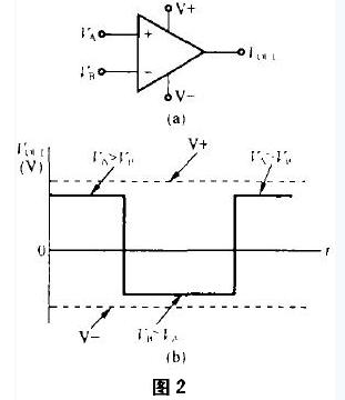 图2(a)是双电源(正负电源)供电的比较器。如果它的VA、VB输入电压如图1(b)那样,它的输出特性如图2(b)所示。VB>VA时,Vout输出饱和负电压。
