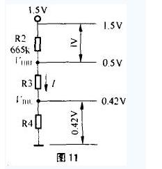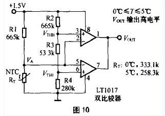 温度传感器采用NTC热敏电阻RT,已知RT在 0℃时阻值为333.1kΩ;5℃时阻值为258.3kΩ,则按1.5V工作电压及流过R1、RT的电流约1.5uA,可求出R1的值。R1的值确定后,可计算出0℃时的VA值为0.5V(按图10中R1=665kΩ时),5℃时的VA值为0.42V,则VTHL=0.42V,VTHH=0.5V。若设R2=665kΩ,则按图11,可求出流过R2、R3、R4电阻的电流I=(1.5V-0.5V)/665kΩ=0.0015mA,按R4×I/=0.42V,可求出R4=280kΩ,再按0.5V=(R3+R4)0.0015mA可求出R3=53.3kΩ。