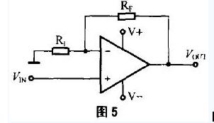 同相放大器电路如图5所示。如果图5中RF=∞,R1=0时,它就变成与图3(b)一样的比较器电路了。图5中的Vin相当于图3(b)中的VA。