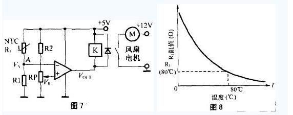 一些大功率器件或模块在工作时会产生较多热量使温度升高,一般采用散热片并用风扇来冷却以保证正常工作。这里介绍一种极简单的温度控制电路,如图7所示。负温度系数(NTC)热敏电阻RT粘贴在散热片上检测功率器件的温度(散热片上的温度要比器件的温度略低一些),当5V电压加在RT及R1电阻上时,在A点有一个电压VA。当散热片上的温度上升时,则热敏电阻RT的阻值下降,使VA上升。RT的温度特性如图8所示。它的电阻与温度变化曲线虽然线性度并不好,但是它是单值函数(即温度一定时,其阻值也是一定的单值)。如果我们设定在80℃时应接通散热风扇,这80℃即设定的阈值温度TTH,在特性曲线上可找到在80℃时对应的RT的阻值。R1的阻值是不变的(它安装在电路板上,在环境温度变化不大时可认为R1值不变),则可以计算出在80℃时的VA值。