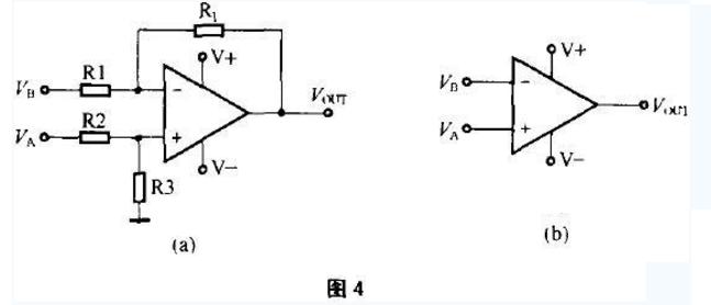 图4(a)由运算放大器组成的差分放大器电路,输入电压VA经分压器R2、R3分压后接在同相端,VB通过输入电阻R1接在反相端,RF为反馈电阻,若不考虑输入失调电压,则其输出电压Vout与VA、VB及4个电阻的关系式为:Vout=(1+RF/R1)·R3/(R2+R3)VA-(RF/R1)VB。若R1=R2,R3=RF,则Vout=RF/R1(VA-VB),RF/R1为放大器的增益。当R1=R2=0(相当于R1、R2短路),R3=RF=∞(相当于R3、RF开路)时,Vout=∞。增益成为无穷大,其电路图就形成图4(b)的样子,差分放大器处于开环状态,它就是比较器电路。实际上,运放处于开环状态时,其增益并非无穷大,而Vout输出是饱和电压,它小于正负电源电压,也不可能是无穷大。