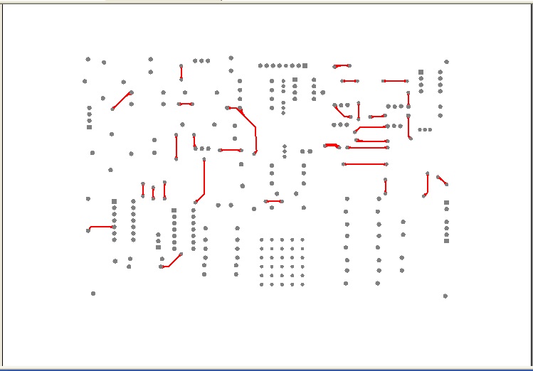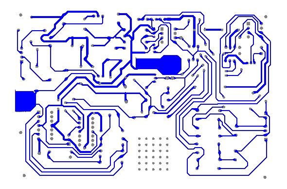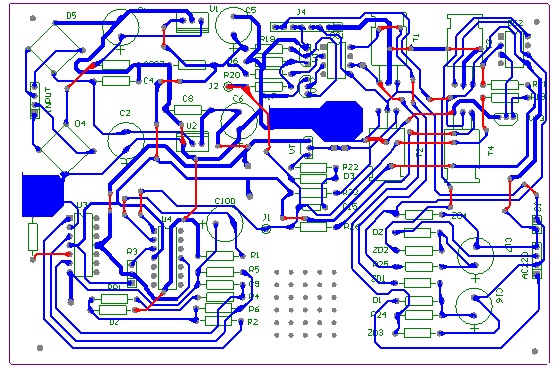 由于采用单面板制版,指打印包含mutilayer与bottomlayer的版图如图3所示。之后,选择100*150mm铜板作为腐蚀对象,撕去表面塑料保护膜,用正规图版纸上打印的图3效果图紧贴铜板,横平竖直轻轻放置在曝光箱内,开启曝光箱电源,约3分钟后关闭电源,在酸洗槽液体内悬浮曝光后铜板,开启腐蚀槽电源,腐蚀20-30分钟后用清水清洗,PCB热转印完成。打孔时,选择1-1.2mm直径针打孔。