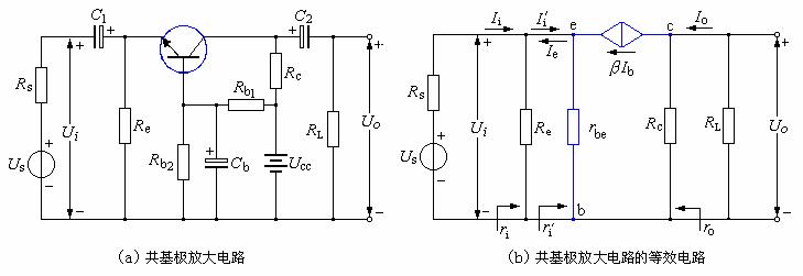 共基极电路是从发射极输入信号,从集电极输出信号。电路和等效电路如下