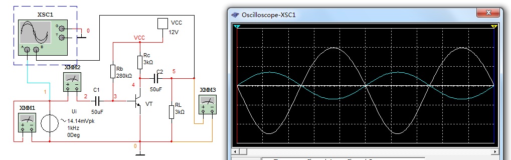 接Ui(f=1kHz,Ui=20mV正弦波),用示波器观察输入信号Ui与输出信号的相位关系是________(同相/反 相),并用交流毫伏表测量Ui=___________________________,Uo=_________________________________