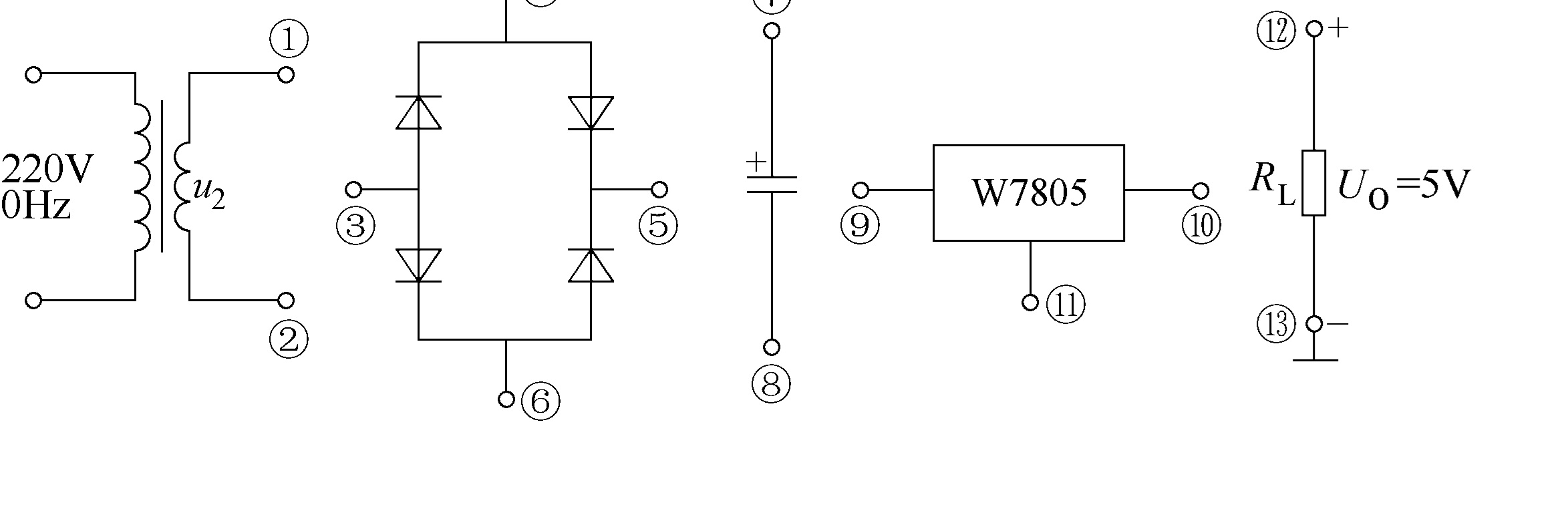 1 、电路如下图所示。合理连线各元器件,使之构成能输出5V的直流电源电路。在原图上正确连线作图。
