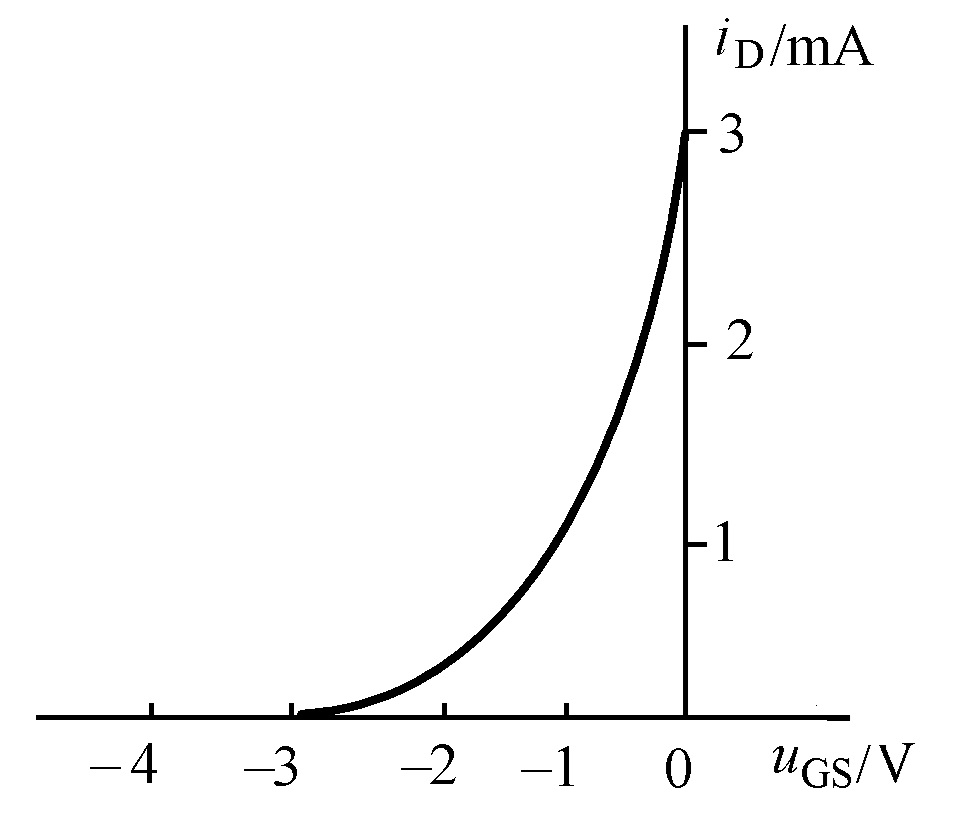 2 一个JFET的转移特性曲线如图所示,试问:①它是N沟道还是P沟道的FET?②它的夹断电压UGS,off和饱和漏极电流IDSS各是多少