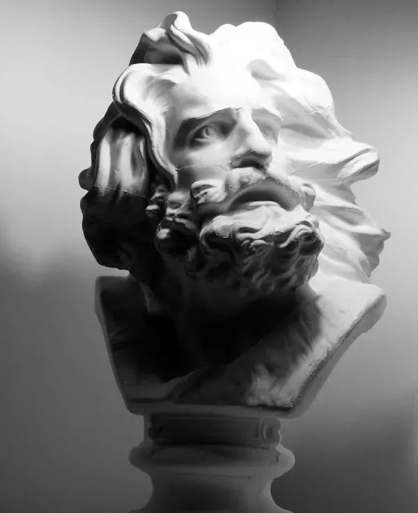 石膏《马赛》头像,体现激昂动感的特点外。在形体上,体块明确、概括;特别是对发须的处理,概括、整体,面向的转折非常明确。素描运用中,明暗交界线明确,形体概括,这些对理解素描很有帮助。