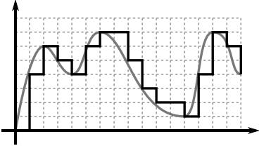 ●DAC:ADC 的逆操作,Digital-to-Analog Converter,它从一串二进制数的序列中产生一种阶梯形波形(如下图),这是朝着产生一个模拟信号的第一步