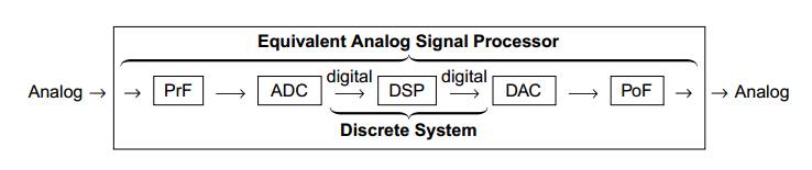 它们能够利用加法器,乘法器和逻辑元件的数字硬件或专用微处理器进行处理。然而需要将模拟信号转换成一种适合于数字硬件的某种形式,这种形式的信号称为数字信号。这种信号在时间的特定时刻取有限个数值中的一个,所以能用二进制数(或比特)来表示。这种数字数字信号的处理称为 DSP,用方框图的形式表示为: