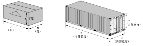 其中,“∥” 意为平行;“A”代表纸箱外部长;“B”代表纸箱外部宽;“C”代表纸箱外部高;“D”代表集装箱内部长;“W”代表集装箱内部宽;“H”代表集装箱内部高。各部分的示意如图8-6所示。