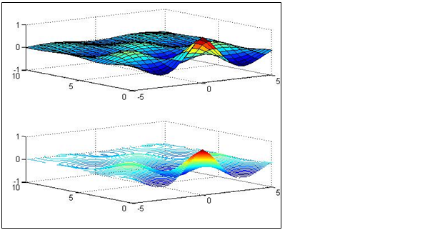 其中x的21个值均匀分布在[-5,5]范围,y的31个值均匀分布在[0,10],要求使用subplot(2,1,1)和subplot(2,1,2)将产生的曲面图和登高图画在同一个窗口上。