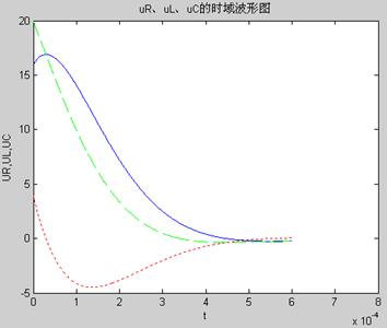 title('uR、uL、uC的时域波形图'); %加图形标题
