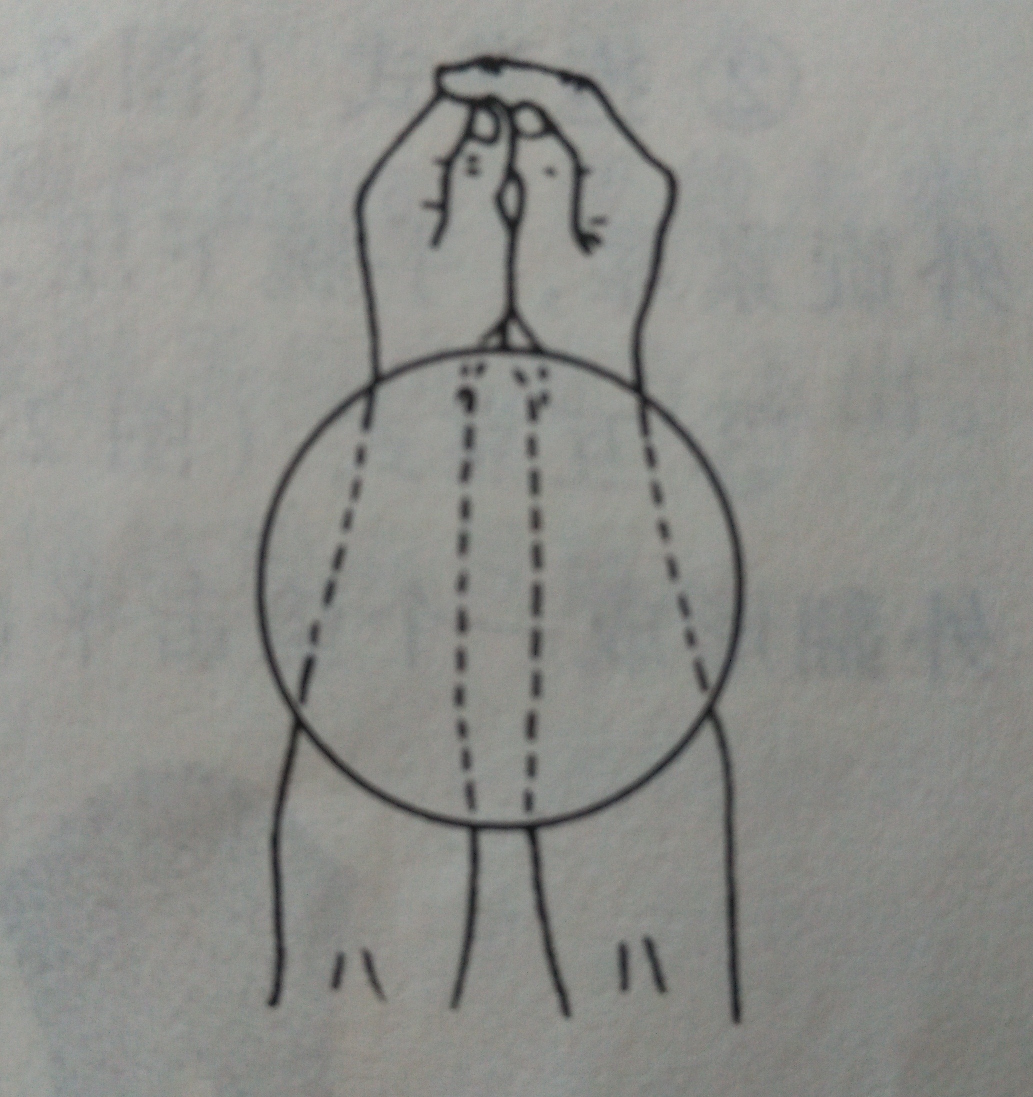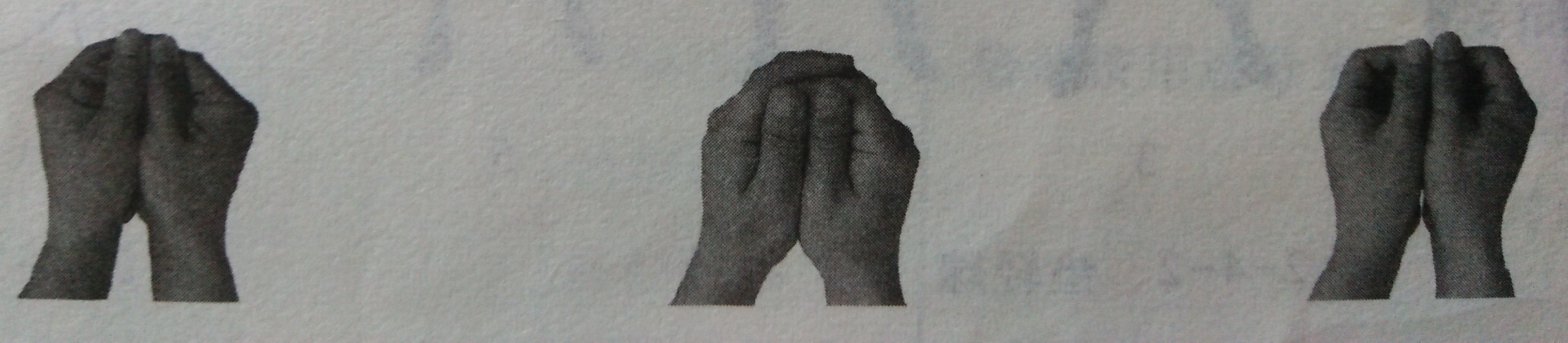 ①叠指式:两手掌根相靠,两手手指重叠,手掌互握,两指平行向前,手腕下压,两前臂外翻成一个平面。