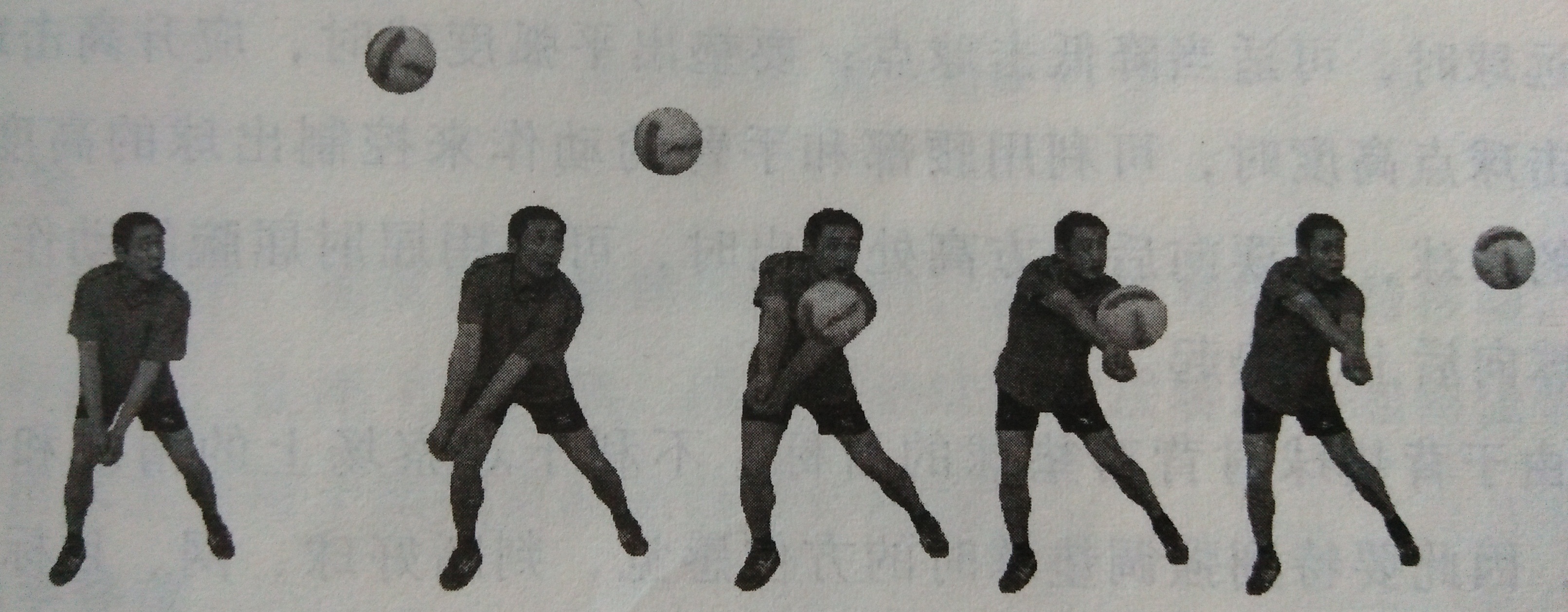(2)垫中等力量:准备姿势、击球点和手型与垫轻球相同。手臂迎击球动作的速度要放慢,手臂要适当放松,主要靠球本身的反弹力将球垫起。击球时,要运用蹬地、跟腰、提肩、压腕、向前抬臂的动作击球的后下部。