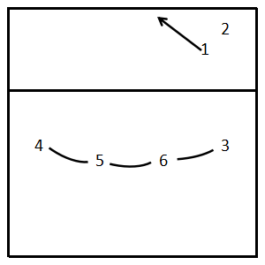 是指由3号位队员作二传,将球传给4号位、2号位两点进攻或后排队员三点进攻的组织形式(图3.4-1)。“中二三”进攻阵型在立体进攻战术未出现年代时称为“中一二”进攻阵型,两者的区别在于“三”,突出后排三点立体进攻。