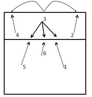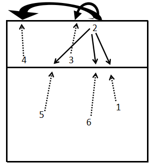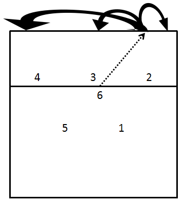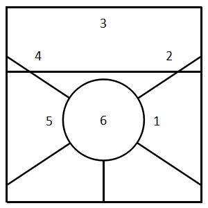 “死跟”防守阵型(图3.4-13):“死跟”的基本站位形式是1号位队员跟进到拦网队员身后防吊球及前区球。如果一号位队员是二传球员,则便于随时插上接应防起的球,组织防反。6号位队员向右移位补防扣向1号区的直线球。5号位队员防后场5号区大斜线球,4号位队员后撤防小斜线球。缺点是6号区无人防守。