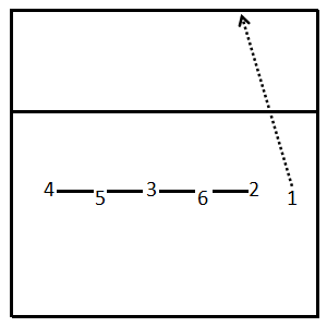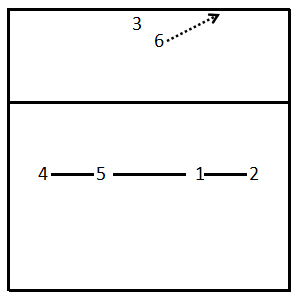 (e)“隐蔽”站位:接发球站位时,前排进攻队员隐蔽地站在后排队员接发球的位置上,并把后排队员安排在前排接发球的位置上进行佯攻,以达到迷惑对方拦网队员和出其不意袭击对方的目的。