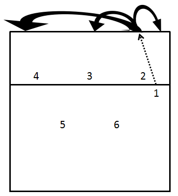 “活跟”防守阵型(图3.4-14):“活跟”的基本站位形式是1号位队员防后场直线球,当判断对方吊球或拦网后球落在前区,则及时跟进防守。同时6号位队员注意弥补1号区的空当,4号位、5号位队员防斜线。4号位队员还要负责防守吊到前场左区的球。6号位队员的摆动和防吊球意识极为重要。