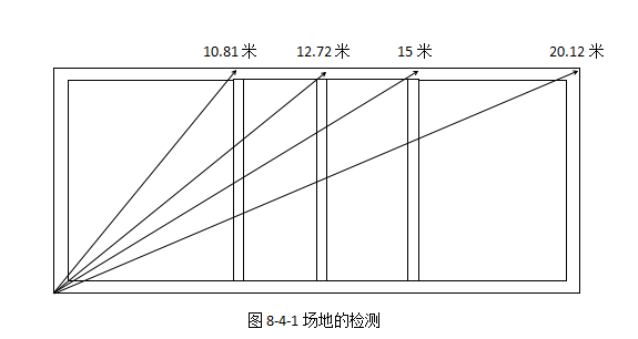 (1)主要对场地线宽度、长度及场地的区域是否呈长方形等进行丈量检查。一般采用三角式勾股定理进行计算,可将场地的长方形分割成几个三角形,然后进行丈量。(图8-4-1场地的检测)