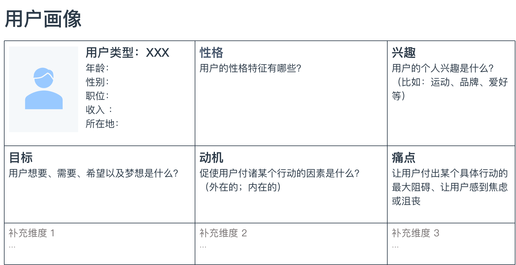 目标和需求、挫折(或“痛点”)、行为、个性(例如,捕捉个性口号)等