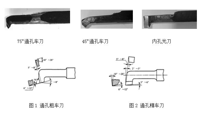 通孔车刀切削部分的几何形状基本上与外圆车刀相似,为较小径向切削挤力,防止振动,主偏角应取得大一些,通孔粗车刀(图1)的主偏角一般为Kr=60º~75º,有的主偏角为45 º,副偏角一般取15º~30º,为防止车孔刀后面和孔壁的摩擦又不使后角磨得太大,一般磨成两个后角,其中α01取6º~12º,α02取30º左右;通孔精车刀(图2)的主偏角一般为92º~95º,与盲孔车刀相似;内孔精加工通常也使用高速钢内孔车刀,其主偏角一般为90º。