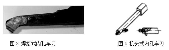 内孔车刀可以制成焊接式(图3);也制作成机夹式(图4),把高速钢和硬质合金做成较小的刀头,安装在碳素钢和合金结构钢制成的刀柄前端的方孔中,并在顶端或上面用螺钉紧固,以达到节省刀具材料、增加刀柄强度目的。