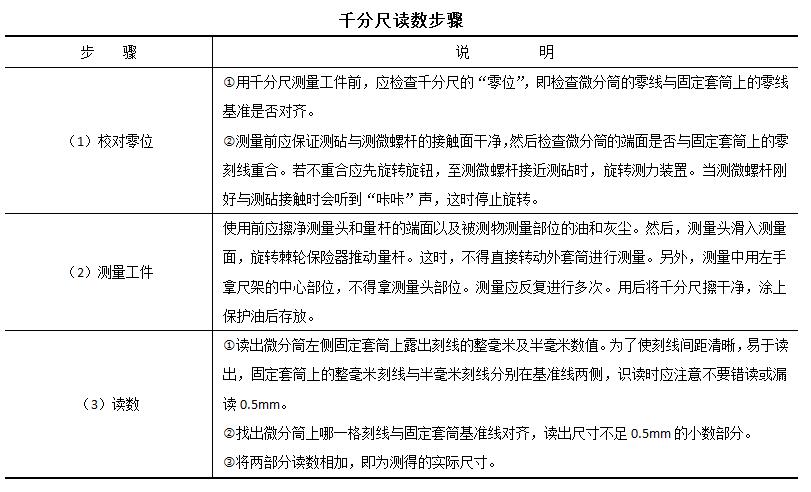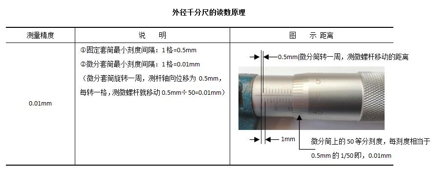 通过螺旋传动,将被测尺寸转换为丝杠的轴向位移和微分筒的圆周位移,从固定套筒刻度和微分套筒刻度上读取测量头和测杆测量面间的距离,如下表。