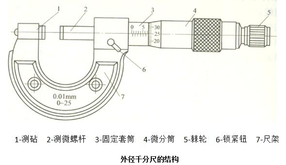 外径千分尺的结构由固定尺架、测砧、测微螺杆、固定套管、微分筒、测力装置等组成,详见下图。