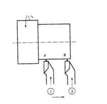 装上工件,车好外圆。松开小托板并转动小托板α/2,锁紧小托板,小托板刻度调零,移动中托板使90º车刀刀尖接触A点(见图1-5-5),记住A点中托板的刻度,退中托板。移动小托板距离为L1,此时为B点,再移动中托板对刀。若B点中托板的刻度与A点的种托板的刻度相差(D-d)/2,说明锥度已找正,锁紧转盘,此种方法一般不需时切削,找正精度不高。
