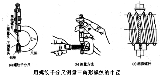 ③中径的测量。在三角螺纹的中径可用螺纹千分尺测量。它的结构与外径千分尺基本相同,只是它的两个侧量头不是平的。而是与螺纹牙型相吻合的一个圆锥体(和牙谷配合)和一个凹槽(和牙尖配合)。一把螺纹千分尺可根据牙型角(公制为60︒,英制为55︒)的不同和螺距的大小而配备一套大小不同的测量头。测量各种不同的螺纹,只需选用合适的测量头装上即可。测量时,应先校对零点,然后把两个触头卡在螺纹的牙型上,所测得的百分尺的读数便是该螺纹中径的实际尺寸。