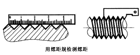 ②螺距的测量。在车削螺纹螺旋线第一刀时,就要检测螺距是否正确。可以用钢直尺或游标卡尺同时测量几个螺距后取平均值。螺纹车削完成后可以用螺距规检测螺距大小,检测时,应将螺距规沿着通过工件轴线的平面方向嵌入牙槽中,如螺距规与牙槽能完全吻合,则说明被测螺距是正确的。