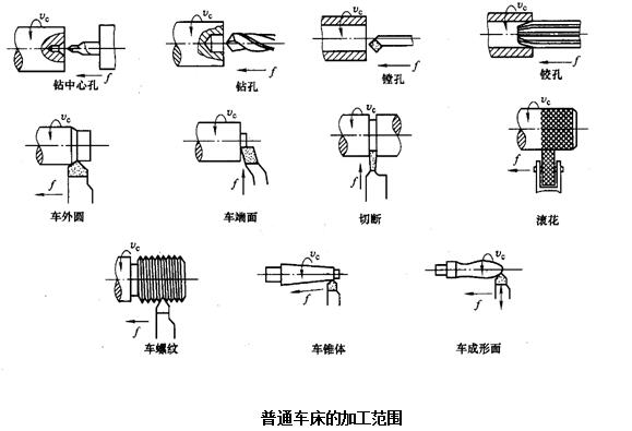 凡具有回转体表面的工件,都可以在车床上用车削的方法进行加工。此外,车床还可以绕制弹簧。卧式车床的加工范围下图所示。