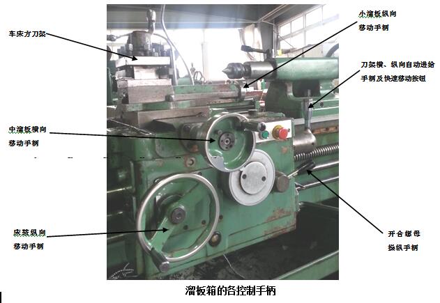 溜板部分实现车削时绝大部分的进给运动:床鞍及滑板箱作纵向移动,中滑板作横向移动,小滑板可作纵向或斜向移动。进给运动有手动进给和机动进给两种方式。如下图所示。