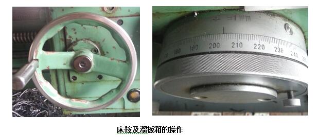 床鞍及溜板箱的纵向移动由滑板箱正面左侧的大手轮控制,逆时针方向转动手轮时,床鞍向左纵向移动作进给;反之,床鞍向右纵向移动退出。手轮轴上的刻度盘圆周等分为300格,手轮每转过1格,刀架纵向移动1mm,如下图所示。