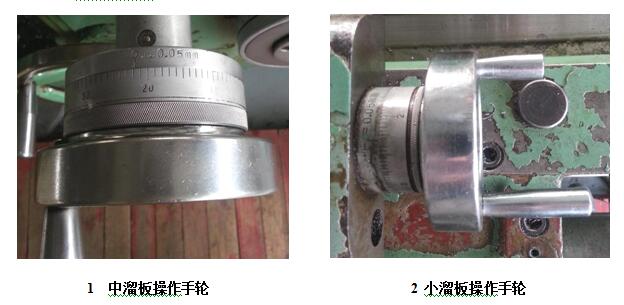 小溜板在小溜板手柄控制下可作短距离的纵向移动。顺时针转动小溜板手柄,小溜板向左移动进给;反之,小溜板向右移动退出。小溜板的手轮轴上的刻度盘圆周等分为100格,手轮每转过1格,纵向或斜向移动0.05mm。小溜板的下导轨有转盘,斜向进给车削短圆锥时,可顺时针或逆时针方向旋转90°。调整时,先松开锁紧螺母,转动小溜板至所需角度位置后,再锁紧螺母小溜板固定。如下图2。