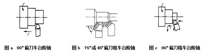 轴间较高的台阶轴零件,即相邻的两圆柱面的直径尺寸相差较大,可先用一把主偏角小于90º的车刀粗车,可选用75º或45º的偏刀粗车外圆(下图b),再把90º的偏刀主偏角装成93º~95º(下图c),分几次进给。