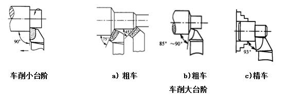 (2)轴间较大的台阶轴 轴间较大的台阶轴工件,一般分粗、精车进行。粗车时可选用75º或45º的偏刀(图 a)或主偏角85º~90º偏刀(图 b),车削至台间处留精加工余量;精车时选用90º偏刀,车刀的主偏角应大于90º,一般为93º(图c),安装车刀时应注意刀具的主偏角。精车外圆到台阶长度后,停止纵向进给,手摇中托板手柄使车刀慢慢均匀退出,从而将工件端面车平,以保证台阶平面与工件轴线的垂直度要求,这样一个台阶即加工完成。