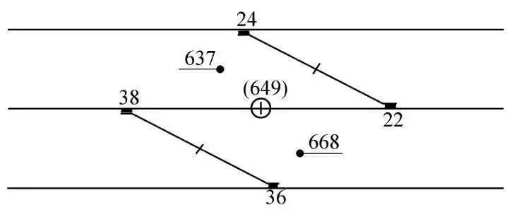 当相邻区段的道岔开通本道岔区段或相邻道岔失去位置表示时,该绝缘节为侵限绝缘;当道岔不开通本区段时,该绝缘节就不是侵限绝缘,即根据相邻道岔位置条件来决定,称为条件侵限绝缘。在进路表中条件侵限绝缘在轨道区段检查栏内附加道岔位置条件标注。在图中,经过36/38号道岔反位进路的轨道区段栏内填写〈22/24〉22DG,表示22/24号道岔在定位时需检查22DG的空闲条件,反之22/24号道岔在反位时就不需要检查22DG的空闲。